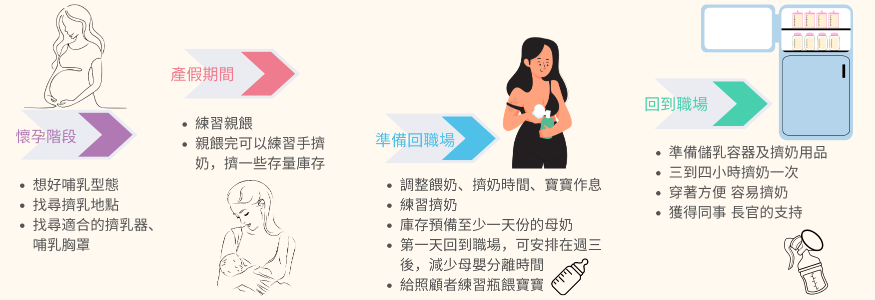 在懷孕階段,其實就可以開始計畫並且看看職場是否有學姊有類似的經驗,觀察她們目前擠奶的方式,思考自己是否能執行,並與同事討論。